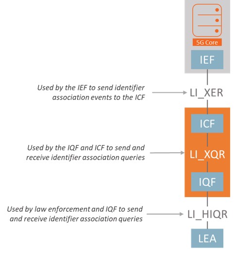 The ETSI-based approach introduces three functional elements to the lawful interception architecture: Identity Event Function (IEF) detects changes in identifiers and provides those changes in the form of identifier association event records to the ICF; Identity Caching Function (ICF) caches identifiers provided by the IEF and answers queries that originate from the IQF; and, Identity Query Function (IQF) handles and responds to real-time requests for identifier associations in the form of queries by law enforcement agencies (LEAs). This is illustrated to the right.