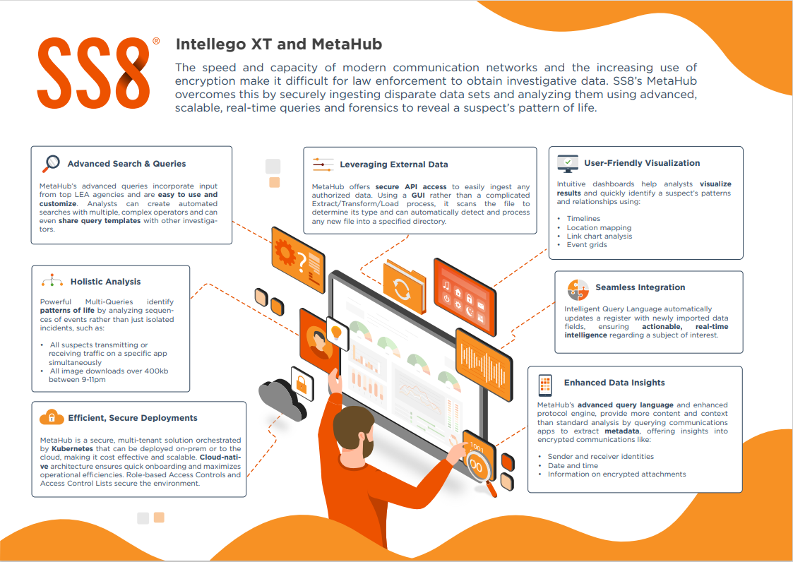 SS8’s Intellego XT and MetaHub offer a secure, scalable, real-time monitoring and analytics suite for actionable intelligence on subjects of interest, helping law enforcement and government agencies save lives. The platform can ingest lawful intelligence, open-source, and third-party data sets and run customizable, shareable queries to help identify patterns of life. It also provides insights into encrypted communications and intuitive visualization tools. Intellego XT and MetaHub support SS8’s mission to help protect society and promote public safety.